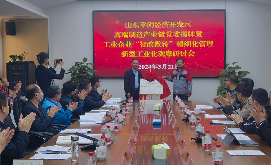 3月21日,平陰經濟開發區黨(dang) 工委高端製造產(chan) 業(ye) 鏈黨(dang) 委揭牌儀(yi) 式暨工業(ye) 企業(ye) “智改數轉”精細化管理、新型工業(ye) 化觀摩研討活動在公司順利舉(ju) 辦。平陰經濟開發區黨(dang) 工委委員、管委會(hui) 副主任王蘭(lan) 華,新利娱乐体育官网黨(dang) 委書(shu) 記、董事局副主席郭雷,科德智能總裁劉少雲(yun) 等縣域內(nei) 30餘(yu) 家製造業(ye) 企業(ye) 領導參加了本次活動。