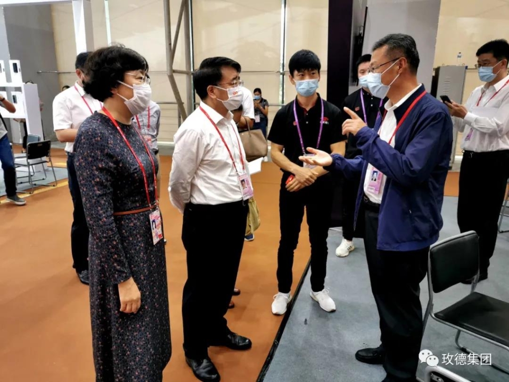 山東(dong) 省商務廳廳長張德平、副廳長呂偉(wei) 及濟南市副市長尹清忠蒞臨(lin) 新利娱乐体育官网展位,詢問公司發展情況。何慶總監贈送新利娱乐体育官网60周年慶徽章。