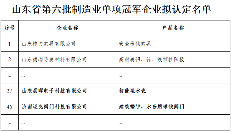 近日,山東(dong) 省工業(ye) 信息化廳公示了第六批山東(dong) 省製造業(ye) 單項冠軍(jun) 擬認定名單和第三批複核擬通過名單,新利娱乐体育官网榜上有名,山東(dong) 晨暉電子科技有限公司、濟南邁克閥門科技有限公司、新利娱乐体育官网臨(lin) 沂有限公司紛紛入選,接連榮獲三個(ge) 單項冠軍(jun) 。