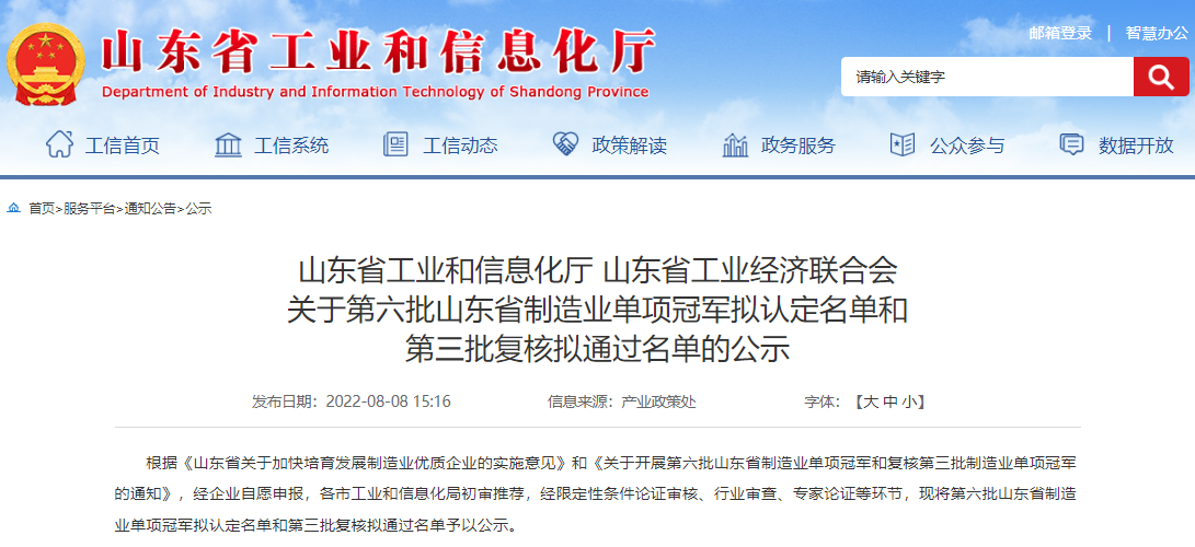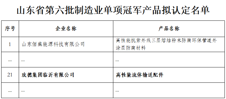 山東(dong) 省製造業(ye) 單項冠軍(jun) 產(chan) 品