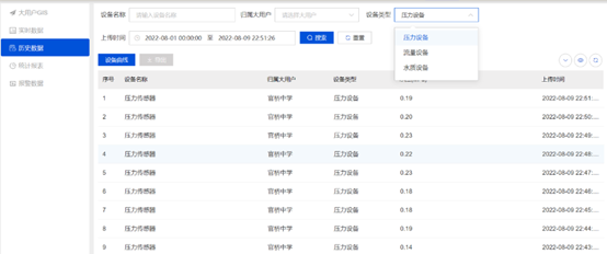 SCADA係統為(wei) 客戶提供了多元化的曆史數據查詢方式,客戶可按日、周、月等時間形式或按照壓力、流量、水質等設備類型進行水源、水廠、監測點、大客戶等的綜合查詢,幫助客戶多維度分析數據,實現數據更深層的價(jia) 值,同時提供了導出報表的功能,取代了原來紙質記錄及每日上報的工作,實現了客戶的高效辦公。