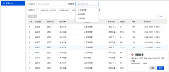 SCADA係統為(wei) 客戶提供多種靈活的報警配置,包含限值報警、振幅報警、伴隨報警,客戶可根據不同的場景選擇不同的報警配置,同時係統還會(hui) 通過彈窗、圖標變紅、語音提醒多種方式及時提醒調度人員異常情況,為(wei) 客戶做到報警全方位,配置多元化,從(cong) 而達到降低漏損的目的。