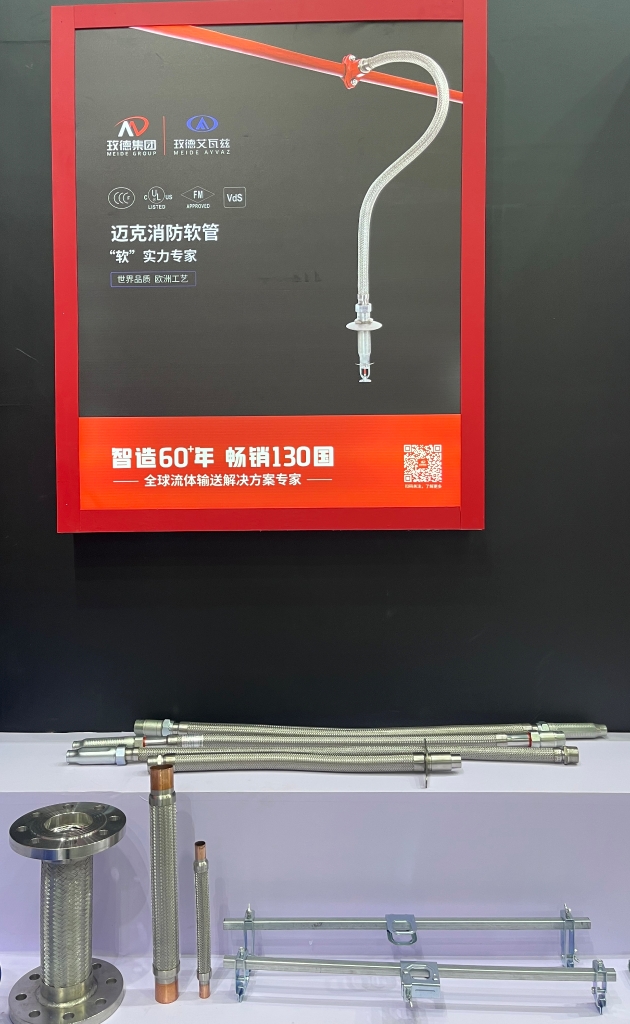 消防金屬軟管專(zhuan) 業(ye) 名稱為(wei) 消防灑水軟管,主體(ti) 材質不鏽鋼,包含不鏽鋼軟管(即波紋管)和安裝組件,用於(yu) 自動噴淋係統中噴淋頭與(yu) 主管的連接,代替傳(chuan) 統硬管。玫德艾瓦茲(zi) 消防軟管具備獨特優(you) 勢:
