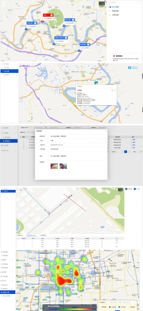 高效事故處理:發現壓力異常→就近安排巡檢員→現場巡檢上報→係統爆管分析→鎖定影響區域→下發停水通知→遠程閥門關(guan) 閉→派發維修工單。