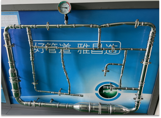 公司試驗室常年展示的不鏽鋼雙卡壓連接示意,在管件和管材極端變形的情況下,產(chan) 品依然能夠實現保壓穩定。