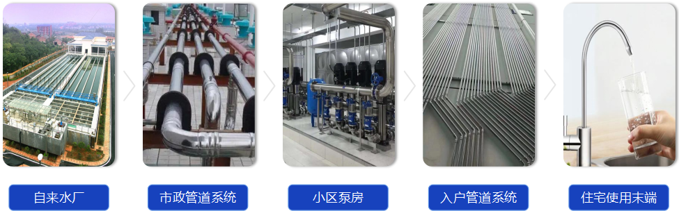 不鏽鋼薄壁管應用場景包含自來水廠、市政管道係統、小區泵房、入戶管道係統、住宅使用末端。
