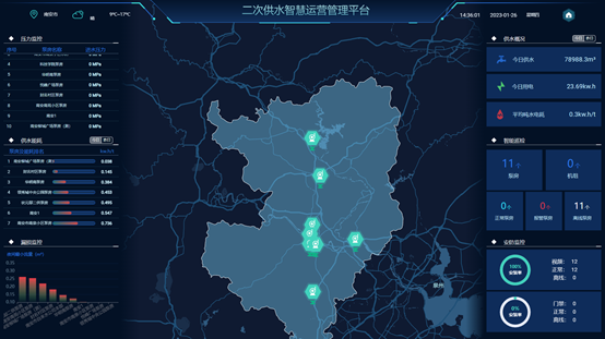 通過一張圖可以實時監測泵房各項指標數據,將泵房能耗分析、二次供水壓力分布、泵房異常預警報警、泵房巡檢管理、二次供水設備信息等進行匯總展示及分析,實現二次供水的全方位監管監控,提高居民二次供水設施管理水平,改善供水水質和服務質量,促進節能降耗,加強治安防範,保障居民生活飲用水衛生安全及二次供水安全穩定運行。