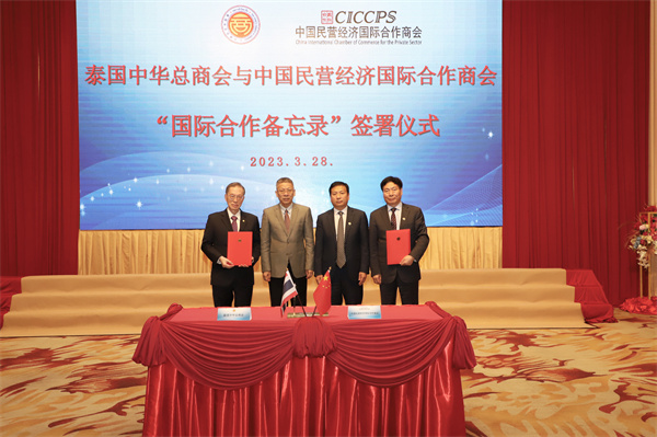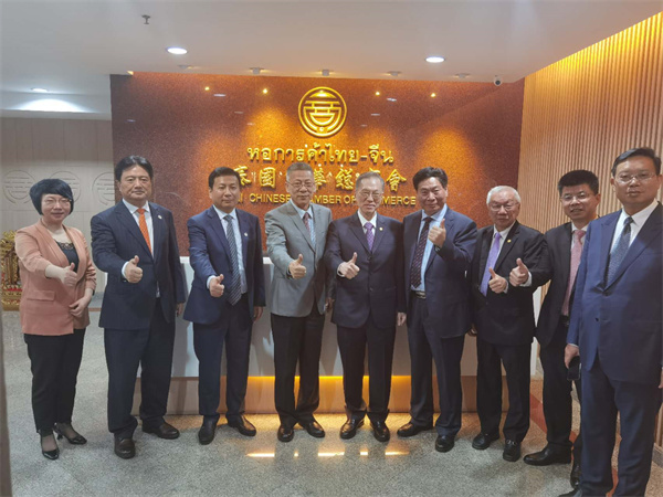 3月28日下午,考察團一行拜訪了泰國中華總商會(hui) ,中國駐泰大使館商務公參王立平、泰國中華總商會(hui) 副主席何克家、泰國中華總商會(hui) 副秘書(shu) 長蕭漢銘、歐先梓先生以及商會(hui) 其他領導一起出席交流活動,孔主席代表考察團發表致辭,並參與(yu) 了泰國中華總商會(hui) 與(yu) 中國民營經濟國際合作商會(hui) “國際合作備忘錄”簽署儀(yi) 式,雙方互贈禮物並合影留念。