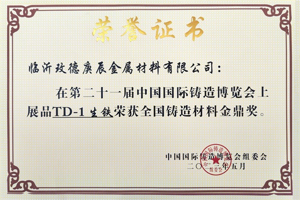 臨(lin) 沂玫德庚辰金屬材料有限公司展品“TD-1生鐵”榮獲全國鑄造材料金鼎獎。