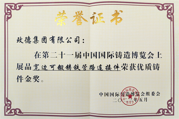 18新利体育入口展品“寬邊可鍛鑄鐵管路連接件”榮獲優(you) 質鑄件金獎。