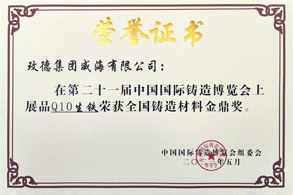 新利娱乐体育官网威海有限公司展品“Q10生鐵”榮獲全國鑄造材料金鼎獎。