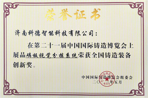 濟南科德智能科技有限公司展品“磷板視覺分揀係統”榮獲全國鑄造裝備創新獎。