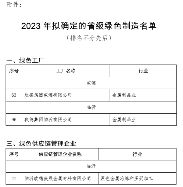 7月28日,山東(dong) 省工業(ye) 和信息化廳公布了2023年(第一批)省級綠色製造名單。新利娱乐体育官网3家企業(ye) 入選,其中新利娱乐体育官网威海有限公司、新利娱乐体育官网臨(lin) 沂有限公司被評為(wei) 為(wei) 山東(dong) 省綠色工廠,臨(lin) 沂玫德庚辰金屬材料有限公司被評為(wei) 山東(dong) 省綠色供應鏈管理企業(ye) 。