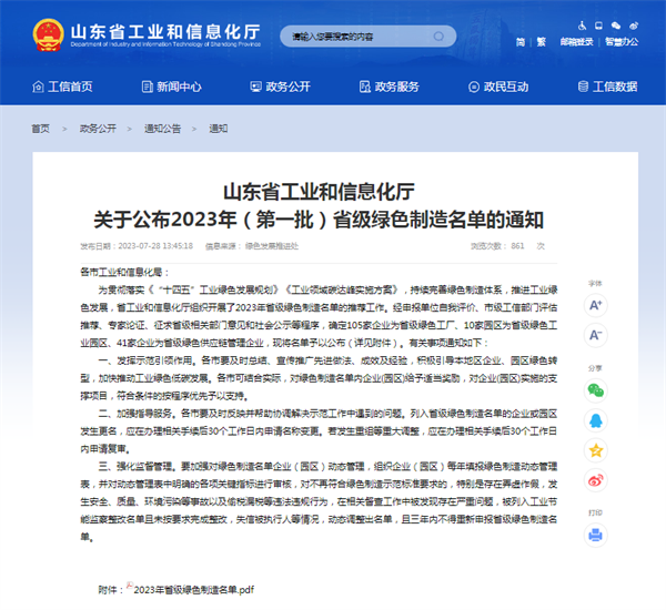 2023年山東(dong) 省綠色製造名單入圍情況: