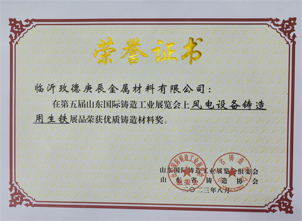 3. 臨(lin) 沂玫德庚辰金屬材料有限公司展品“風電設備鑄造用生鐵”榮獲“優(you) 質鑄造材料獎”。
