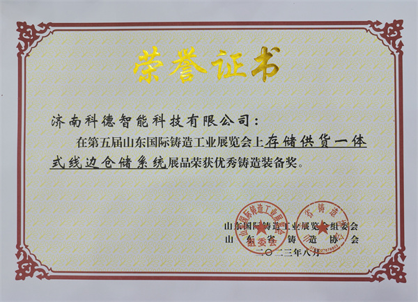 2.濟南科德智能科技有限公司展品“存儲(chu) 供貨一體(ti) 式線邊倉(cang) 儲(chu) 係統”榮獲“優(you) 秀鑄造裝備獎”。