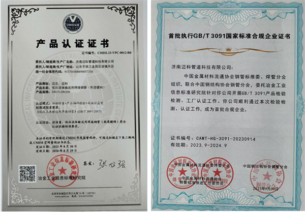 為(wei) 了促進企業(ye) 規範經營,維護國標產(chan) 品形象和合規企業(ye) 公信力、競爭(zheng) 力,保障用戶合法權益,2023年3月15日,由中國金屬材料流通協會(hui) 焊管分會(hui) 牽頭,聯合中國鋼結構協會(hui) 鋼管分會(hui) 、冶金工業(ye) 信息標準研究院及國內(nei) 主要焊管企業(ye) ,正式啟動了行業(ye) 首個(ge) 自律規範組織——中國金屬材料流通協會(hui) 鋼管標準推進工作委員會(hui) (簡稱“中金協鋼管標推委”),隨後組織開展了GB/T 3091-2015產(chan) 品認證工作。2023年10月16日,由四大權威機構聯合發布的首批入圍《執行GB/T 3091國家標準合規企業(ye) 名錄》的14家企業(ye) 中,濟南邁科管道科技有限公司成為(wei) 首批執行GB/T3091國家標準並獲得鋼管標推委認證合規企業(ye) 之一,同時獲得中國金屬材料流通協會(hui) 授權使用“STS(鋼管標準)”集體(ti) 商標。