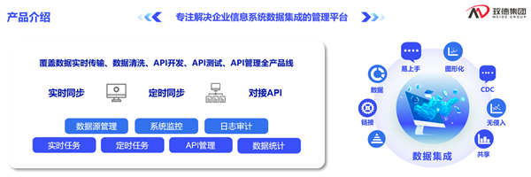 數據集成平台是一款覆蓋數據實時傳(chuan) 輸、數據清洗、API開發、API測試、API管理全產(chan) 品線,專(zhuan) 注解決(jue) 企業(ye) 信息係統數據集成的管理平台。通過平台內(nei) 實時同步、定時同步、對接API等功能,幫助客戶解決(jue) 數據和信息分散、多個(ge) 業(ye) 務係統數據差異性大、接口開發成本高、交換和共享困難等難題。在數據源方麵,平台覆蓋MySQL、SQL Server和Oracle90%主流數據庫,同時支持HTTP和webservice接口數據的采集,100%覆蓋主流應用層通信協議,為(wei) 實現數據的整合提供了更多可能性。在數據處理方麵,平台支持5個(ge) 不同的數據處理組件,包括數據JOIN合並、數據去重合並、數據匯總計算等運算組件,以及字段名映射、字段值映射、數據清洗轉換等數據轉換組件,共11個(ge) 組件可供選擇,以滿足對數據的各種處理需求。