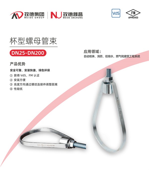 杯型螺母管束,用於(yu) 管道的連接,用來固定管道的位置,適配美標及歐標鋼管。螺母連接到螺紋配件上,螺紋配件再連接到建築或者鋼梁上。可以在垂高度方向上進行調整,螺杆必須完全旋入接頭內(nei) ,以確保達到預定承載力,推薦使用在自動噴淋、消防、給排水、燃氣和建築工程係統。