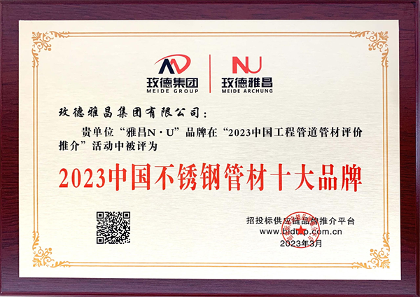 由招投標供應鏈品牌推介平台舉(ju) 辦的“2023中國工程管道管材評價(jia) 推介”活動曆時2個(ge) 多月圓滿結束,在近期發布的“2023中國不鏽鋼管材十大品牌”榜單中,玫德雅昌品牌脫穎而出,突顯了不鏽鋼管材在各類應用領域的顯著優(you) 勢。