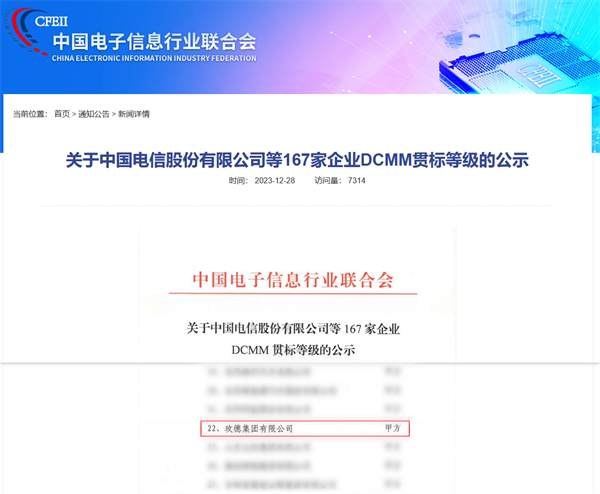 2023年12月28日,中國電子信息行業(ye) 聯合會(hui) 發布了《關(guan) 於(yu) 中國電信股份有限公司等167家企業(ye) DCMM貫標等級的公示》,18新利体育入口成功通過了DCMM《數據管理能力成熟度評估模型》穩健級(3級)貫標認證。