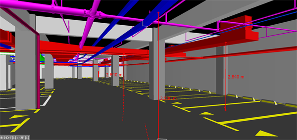 設計階段:在全專(zhuan) 業(ye) 建模的過程中對設計圖紙進行進一步檢查,在模型建立完成後將各專(zhuan) 業(ye) 模型進行匯總,形成設計階段BIM整體(ti) 模型。利用這一整體(ti) 模型進行專(zhuan) 業(ye) 間碰撞檢查,提前發現和規避碰撞問題並優(you) 化設計方案,對優(you) 化後的設計模型進行淨高、空間校核,對於(yu) 不滿足淨高及空間要求的區域,進行二次設計優(you) 化。