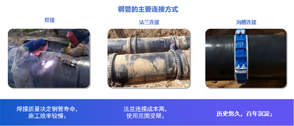 水利輸水管道安裝工程的重點是管材的選擇,長距離輸水管道管材的選用離不開鋼管,目前鋼管連接主要有焊接、法蘭(lan) 連接和溝槽連接3種連接方式。