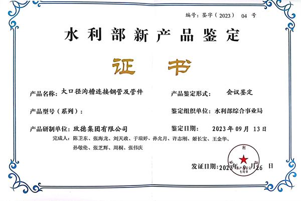 新利娱乐体育官网大口徑溝槽連接鋼管及管件產(chan) 品得到了水利行業(ye) 頂級專(zhuan) 家的認可,鑒定結論為(wei) :該產(chan) 品加工技術及能力達到國際領先水平,產(chan) 品達到國際先進水平。得到了水利部領導及專(zhuan) 家的一致認可。