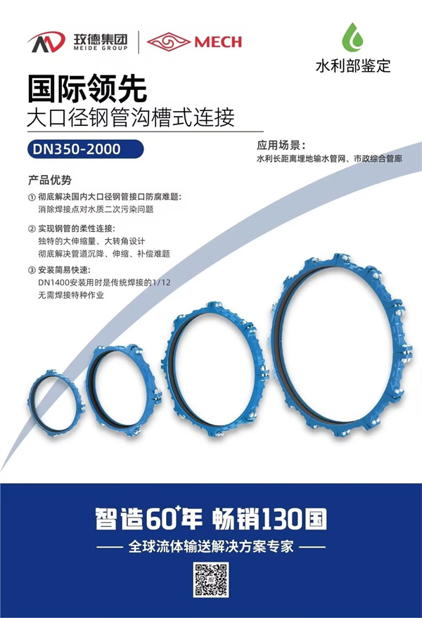 玫德已開發完成的溝槽鋼管、溝槽管件等全係列產(chan) 品,規格從(cong) DN350到DN2000;可以應用於(yu) 水利長距離輸水管網、市政綜合管廊、架空或埋地等應用場景,滿足各種客戶不同的使用要求。