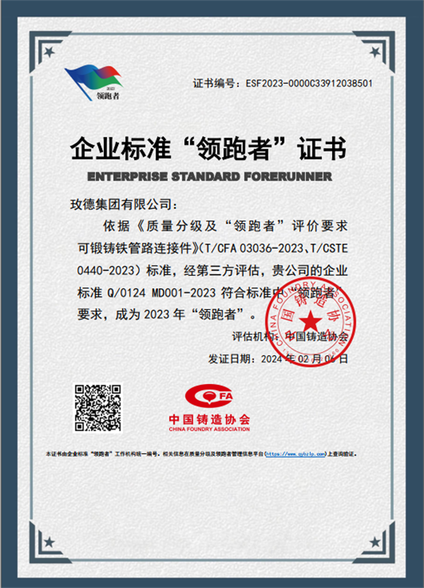 近日,2023 年全國企業(ye) 標準“領跑者”名單發布,18新利体育入口主導製定中國鑄造協會(hui) 團體(ti) 標準《質量分級及“領跑者”評價(jia) 要求 可鍛鑄鐵管路連接件》(T/CFA 03036-2023、T/CSTE 0440-2023)標準,經第三方評估,18新利体育入口製定的企業(ye) 標準《可鍛鑄鐵管路連接件》 Q/0124 MD001-2023入選,榮登2023年企業(ye) 標準“領跑者”榜單。企業(ye) 標準“領跑者”標識是用於(yu) 標注被評估為(wei) “領跑者”的企業(ye) 標準所對應的產(chan) 品或服務的信息標簽。