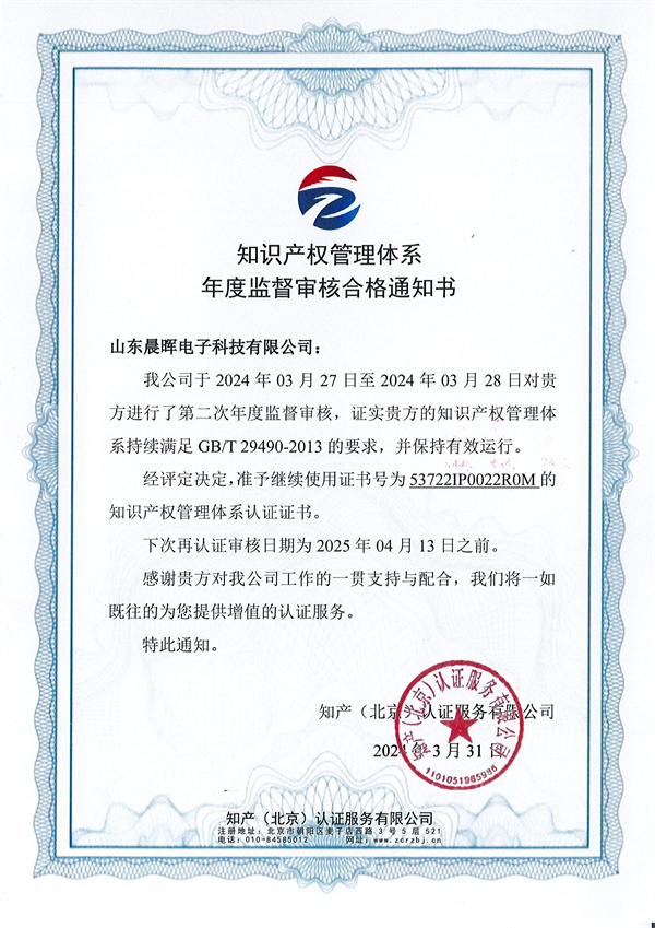2024年3月31日,新利娱乐体育官网旗下山東(dong) 晨暉電子科技有限公司順利通過了知識產(chan) 權管理體(ti) 係年度監督審核。這一認證標誌著山東(dong) 晨暉在知識產(chan) 權管理方麵邁出了堅實的一步,進一步在行業(ye) 內(nei) 樹立了權威和信譽。