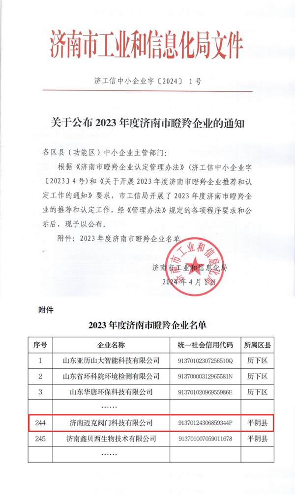 2024年04月07日,濟南市工業(ye) 和信息化局發布《關(guan) 於(yu) 公布2023年度濟南市瞪羚企業(ye) 的通知》,經區(縣)中小企業(ye) 主管部門初審、專(zhuan) 家評審、現場第三方審核等重重審核,新利娱乐体育官网旗下邁克閥門成功通過2023年度濟南市瞪羚企業(ye) 認定。