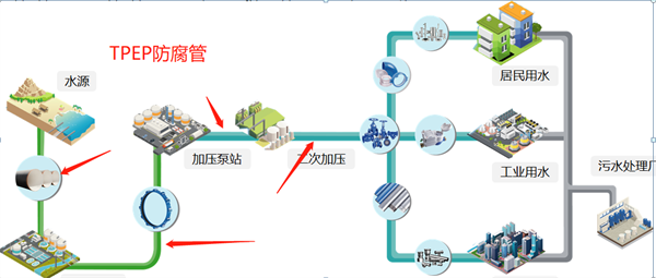 TPEP 防腐鋼管主要應用於(yu) 水源→水廠→加壓泵站→二次加壓這幾個(ge) 階段,大口徑 TPEP 管輸送流量大,提高了階段輸水的效率,保障了居民、工業(ye) 等用戶用水需求;同時,TPEP 防腐鋼管的抗溫、耐磨、耐衝(chong) 擊等性能優(you) 越,滿足多種場景下的使用要求,管道內(nei) 壁采用環氧粉末,保證了用戶用水衛生安全!
