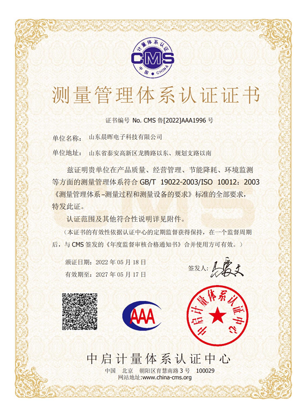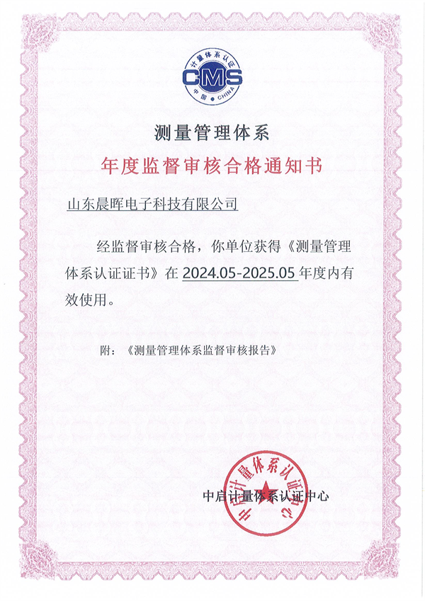 本次審核由權威機構組織進行,涵蓋了山東(dong) 晨暉電子科技有限公司在測量管理體(ti) 係方麵的各項標準及實施情況。經過嚴(yan) 格的審查和評估,山東(dong) 晨暉電子科技有限公司的測量管理體(ti) 係順利通過年度監督審核。