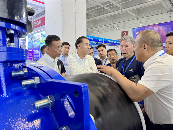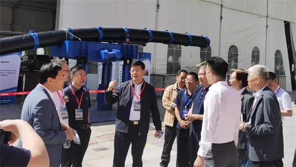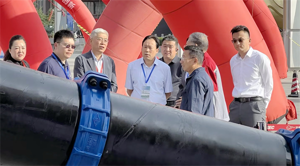 甘肅省水利廳廳長牛軍(jun) ,甘肅省水利廳一級巡視員、省水利學會(hui) 理事長吳天臨(lin) ,甘肅省水利水電勘測設計研究院有限責任公司水利工程正高級工程師張東(dong) 等蒞臨(lin) 新利娱乐体育官网展位參觀指導。參觀到大口徑鋼管柔性連接技術時,牛軍(jun) 廳長講此技術解決(jue) 了管道的很大難題,具有非常廣闊的應用前景。