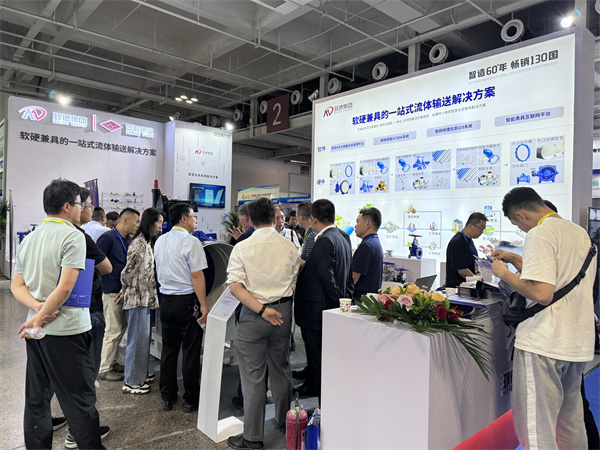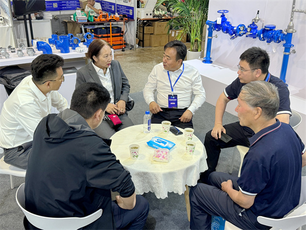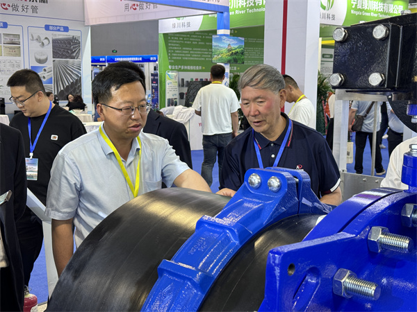 許多參展者慕名前來谘詢大口徑鋼管柔性連接技術,玫德展位人流絡繹不絕。