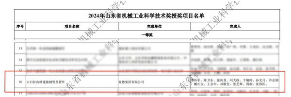 2024年09月08日,山東(dong) 省機械工業(ye) 科學技術協會(hui) 網站下發了《關(guan) 於(yu) 公布2024年山東(dong) 省機械工業(ye) 科學技術獎的通知》,18新利体育入口提報的“大口徑溝槽連接鋼管及管件項目”榮獲山東(dong) 省機械工業(ye) 科學技術一等獎。