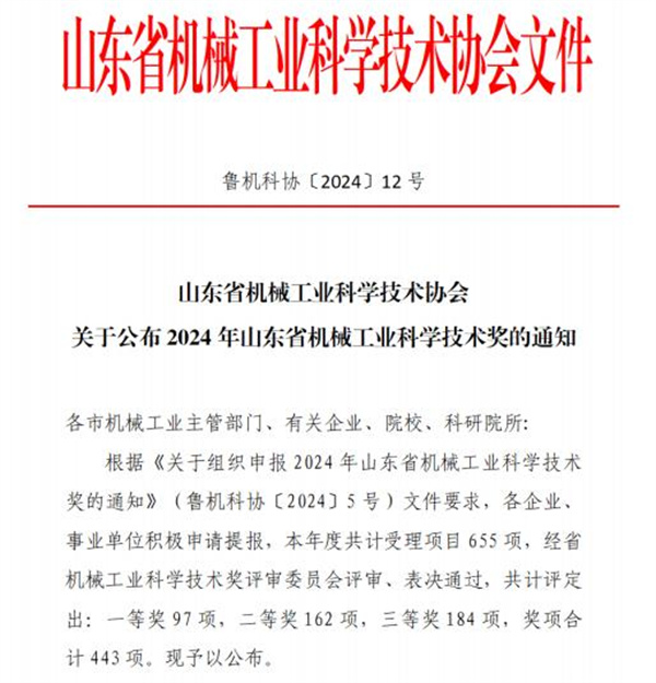山東(dong) 省機械工業(ye) 科學技術獎是省部級科研成果獎,是由山東(dong) 省機械工業(ye) 科學技術協會(hui) 設立的,每年評選一次,旨在選出成果技術創新性突出、技術經濟指標先進、具備顯著應用推廣效益,在推動機械工業(ye) 科學技術進步等方麵有重大貢獻的科技項目,具有較高的含金量。