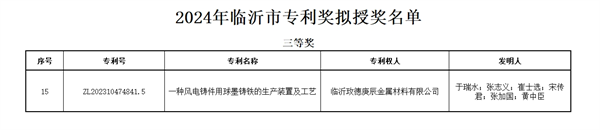近日,臨(lin) 沂市市場監督管理局發布《2024年度臨(lin) 沂市專(zhuan) 利獎擬授獎項目公示》信息,臨(lin) 沂玫德庚辰金屬材料有限公司的專(zhuan) 利項目“一種風電鑄件用球墨鑄鐵的生產(chan) 裝置及工藝”榮獲臨(lin) 沂市專(zhuan) 利獎三等獎。這一榮譽不僅(jin) 是對玫德庚辰在技術創新領域上的肯定,也是對公司研發實力和創新能力的高度認可。