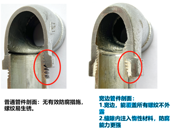 區別於(yu) 傳(chuan) 統管件,玫德寬邊瑪鋼燃氣管件采用突破性的寬邊構造,能將所有螺紋緊密覆蓋,使其完全不外露。這一設計從(cong) 根本上消除了因螺紋裸露,在長期使用過程中可能因磨損、鬆動而引發燃氣泄漏的風險。對比普通燃氣管件連接時,鋼管會(hui) 有 2 - 3 扣螺紋暴露在外的情況,玫德管件的安全性得到了質的提升。