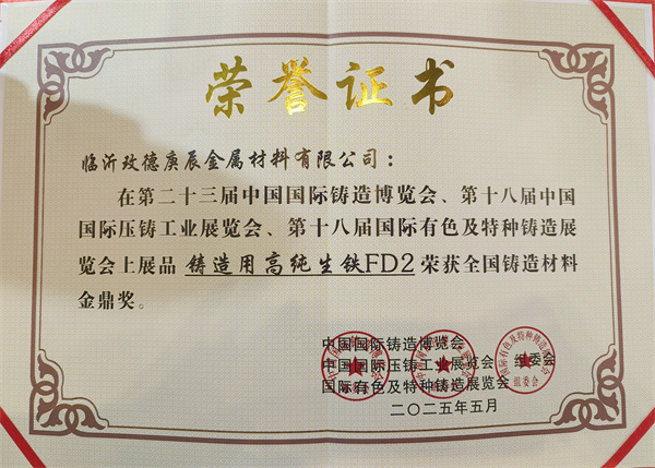 臨(lin) 沂玫德庚辰金屬材料有限公司的鑄造用高純生鐵FD2榮獲“全國鑄造材料金鼎獎”。