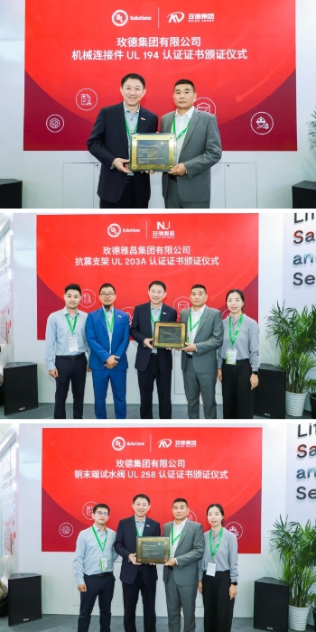 13日上午,在UL展位,UL Solutions全球副總裁、中國大陸及香港地區總經理吳大偉(wei) 頒發給新利娱乐体育官网機械連接件 UL 194 認證證書(shu) 、抗震支架 UL 203A 認證證書(shu) 、銅末端試水閥 UL 258 認證證書(shu) 。