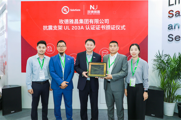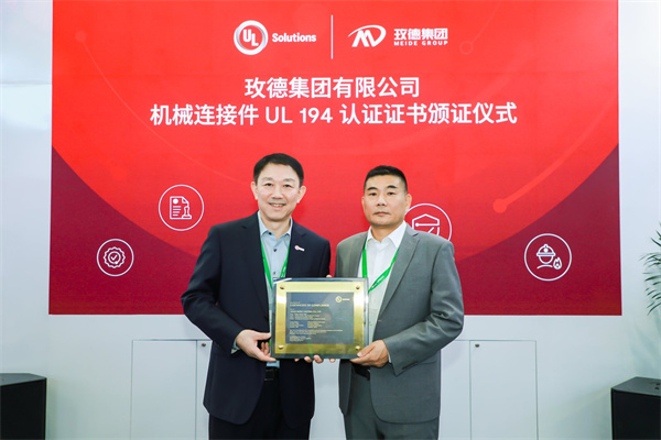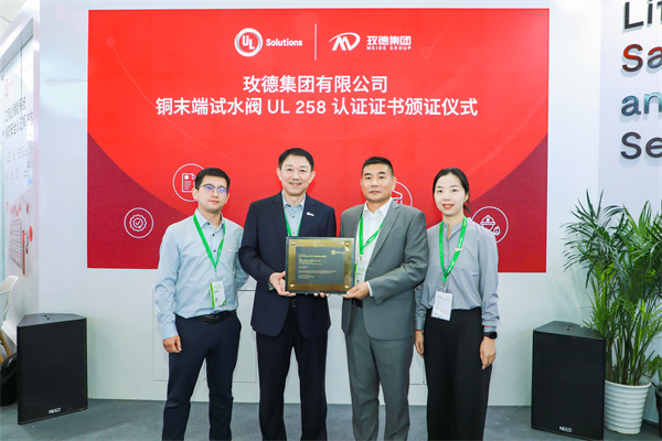 2025年10月13日上午,在第二十一屆中國國際消防設備技術交流展覽會(hui) UL展區,一場隆重的認證證書(shu) 頒證儀(yi) 式吸引了眾(zhong) 多參展商和專(zhuan) 業(ye) 觀眾(zhong) 的目光。新利娱乐体育官网在此榮獲UL Solutions頒發的三項重要產(chan) 品認證證書(shu) ,包括機械連接件UL 194認證、抗震支架UL 203A認證以及銅末端試水閥UL 258認證。UL Solutions全球副總裁、中國大陸及香港地區總經理吳大偉(wei) 親(qin) 臨(lin) 現場頒發證書(shu) ,新利娱乐体育官网山東(dong) 邁科智能科技有限公司高級副總裁李英兵代表集團出席認證證書(shu) 頒證儀(yi) 式,這一重要時刻見證了玫德消防產(chan) 品在國際化征程上的新突破。
